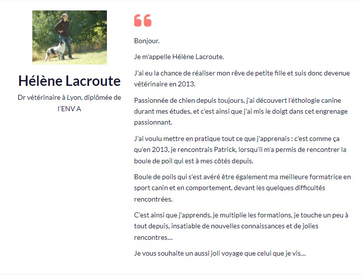 Hélène Lacroute est vétérinaire. Fortement impliquée dans le comportement canin.